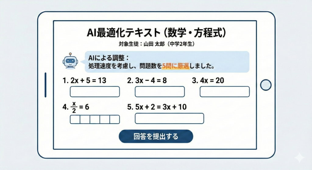 例えば「作業能力が低い子」には、通常よりも問題数を絞る、「言葉で考えるのが得意な子」には言葉での説明を多くするなど、画面上のテキスト自体をAIが最適化。生徒の「できた!」という達成感を引き出します。