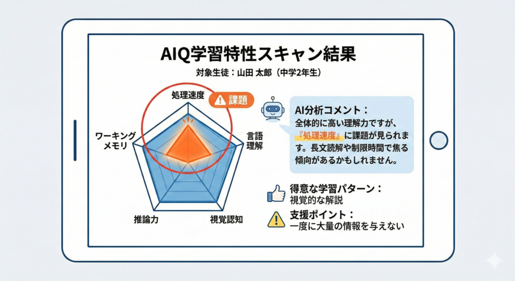 A. はい、もちろん対象です。診断の有無は問いません。 「集中が続かない」「特定の単元だけ極端に苦手」といった、学習面での困りごとを抱えるすべての生徒が対象です。AIQスキャンは学習特性を可視化するためのものですので、医療的な診断とは異なります。安心してご利用ください。