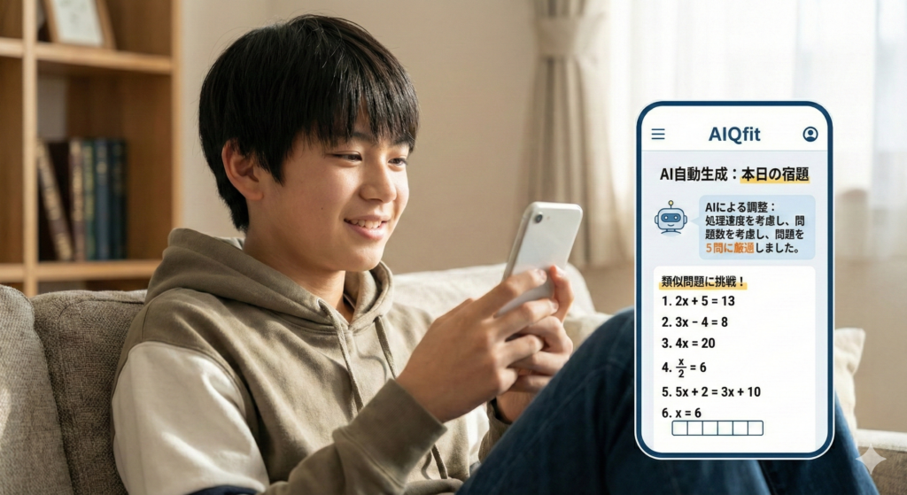 『AIQfit』は、発達障害や勉強が苦手な中学生(※小学生版も拡大予定)を対象とした次世代AI教材パッケージです。独自の「AIQスキャン」による生徒ごとの特性判定から、特性に合わせた問題の最適化、そして学習履歴に基づく保護者向けコメントの自動生成までをワンストップで提供します。
