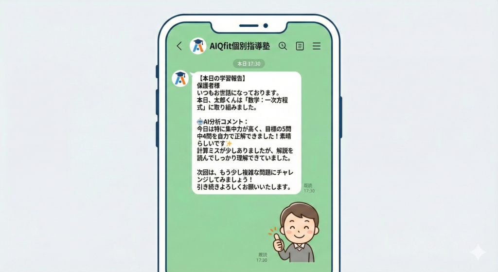 生徒一人ひとりにIDを発行し、日々の学習履歴をシステムに自動蓄積します。保護者も専用画面からログインして履歴を確認できます。 塾側は、その日の「学習履歴」と「履歴からAIが自動生成した保護者向けコメント」を共有するだけでOK。日報や報告書作成の時間を大幅に削減します。