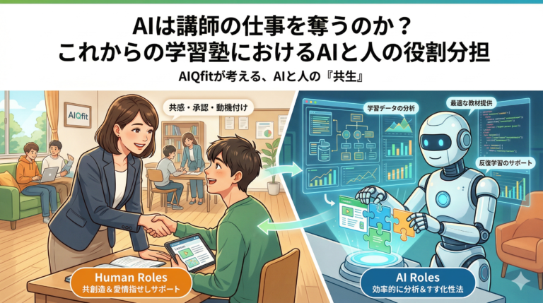 AIに対する「漠然とした不安」の正体 ChatGPTなどの生成AIの普及により、「将来、講師の仕事はAIに取って代わられるのではないか」という議論が盛んです。 しかし、AIQfitが考える未来の教育は、AIと人間が対立するものではなく、お互いの強みを活かした「共生」です。 AIが得意なこと:分析・最適化・反復 AIが圧倒的に優れているのは、膨大なデータの処理です。 人間にしかできないこと:共感・承 […]